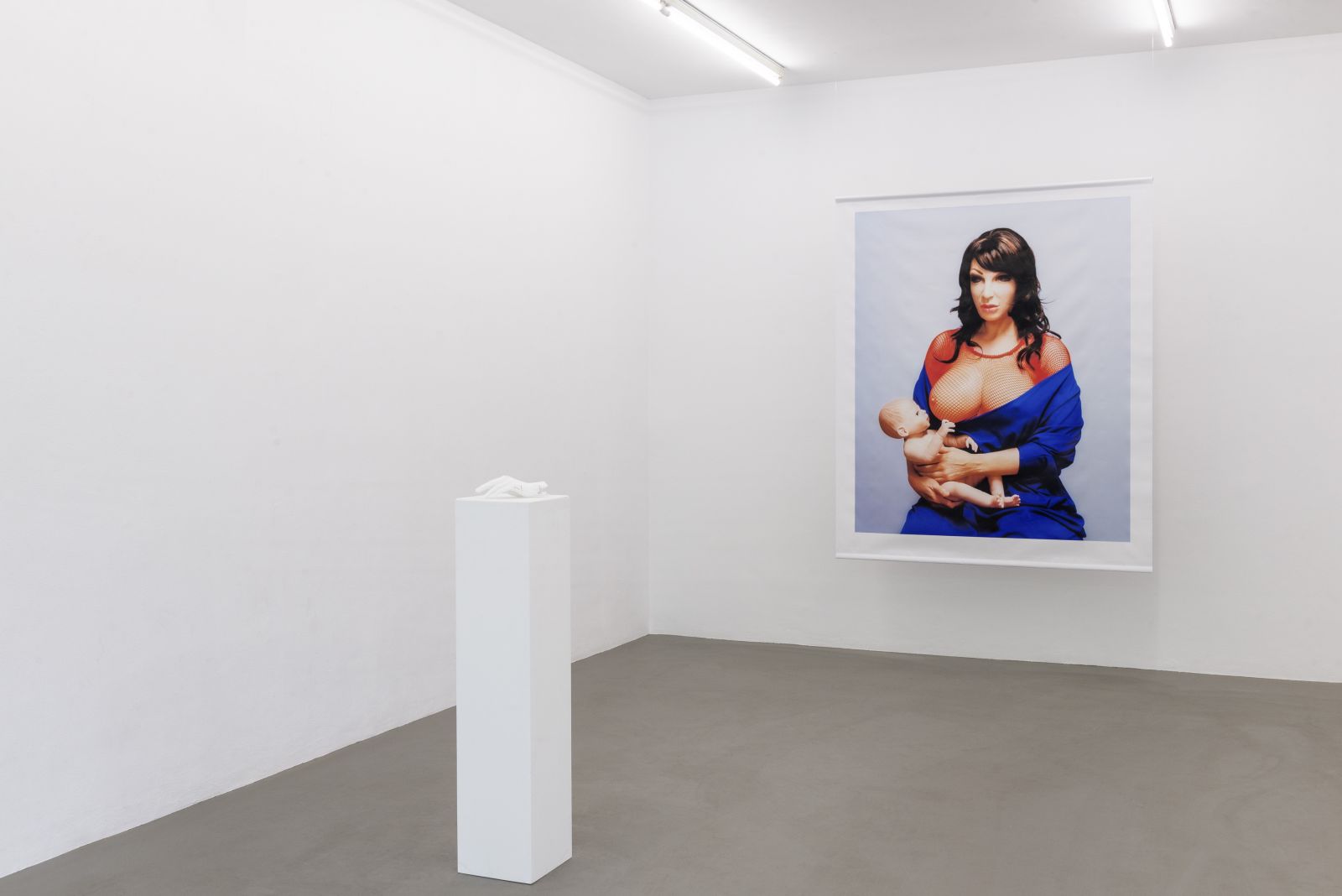 About the work "Madonna & Child“: I have been working with the face mask and silicone breasts for several years and I made a show called "Venus“ last year. But images in the "Venus“ series are all about popular culture, pin-up, porn etc. Since my art history fixation got more acute, I got an idea to make my own version of the Madonna and child theme. It is not about blasphemy, but thinking about myself, a woman who doesn't have a child. It seemed to make sense to make an image of a woman who tries to keep looking young and hot and the baby she's holding is also an artificial one. A mean-looking boy, actually already a man, trying to grab her breast.