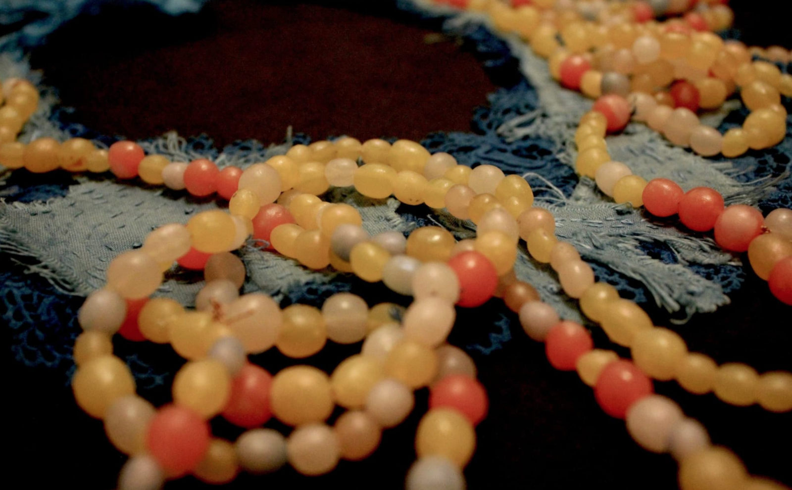 The exhibition presents artistic projects that critically explore biological networks, digital networks, and social networks under the pressure of new technologies. Pictured here is Anna Dumitriu’s object “Engineered Antibody” is a custom beaded necklace based on an antibody engineered to contain a combination of 21 amino acids – which could not occur in nature – but originally it was derived from the blood of an HIV patient. It also contains the actual 21 amino acids found in the antibody.