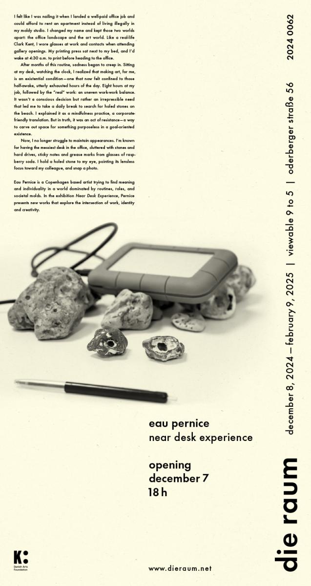 Eau Pernice is a Copenhagen based artist trying to find meaning and individuality in a world dominated by routines, roles, and societal molds. In the exhibition Near Desk Experience, Pernice presents new works that explore the intersection of work, identity and creativity.