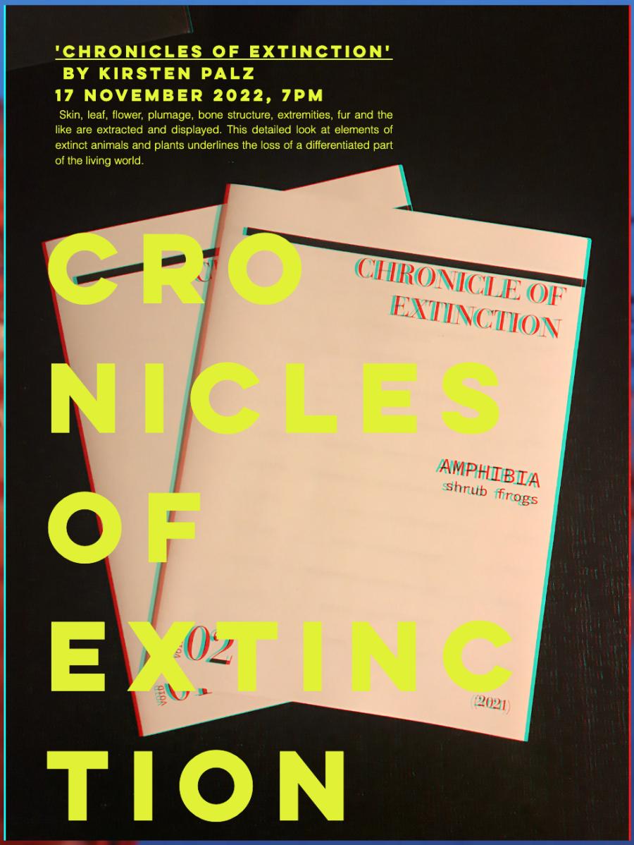 Changing Room presents 'Chronicles of Extinction', a text-based documentation of serial individual works of 12 members each of an extinct species, divided by genus and further classifications. The video work `Probes of Extinction 2022` shows biological details and characteristics of this extinct species. Skin, leaf, flower, plumage, bone structure, extremities, fur and the like are extracted and displayed. This detailed look at elements of extinct animals and plants underlines the loss of a differentiated part of the living world.
