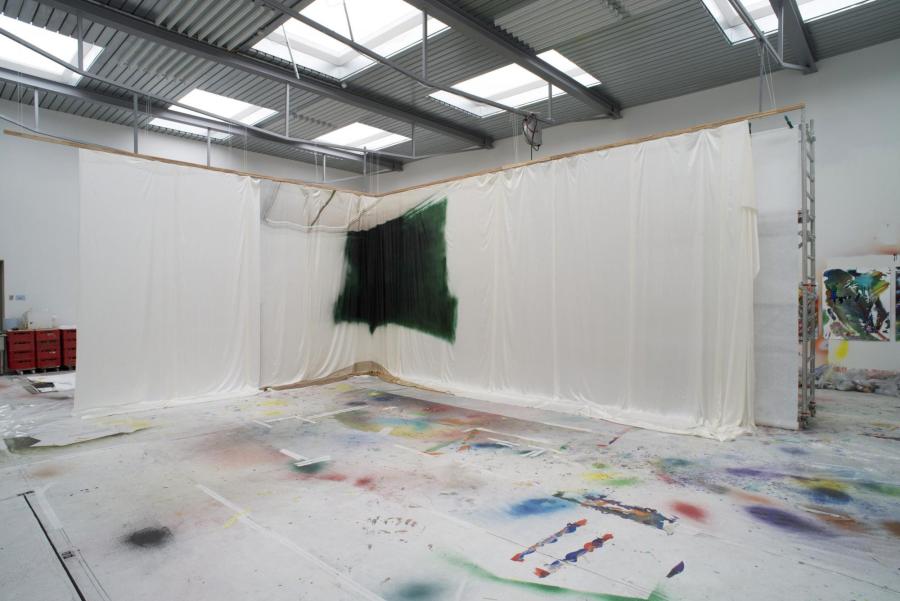 Katharina Grosse (*1961 in Freiburg im Breisgau, lebt und arbeitet in Berlin) ist vor allem bekannt durch ihre großen, raumgreifenden Malereien, die der Farbe einen die üblichen Dimensionen des Bildes übersteigenden Spielraum erschließen. Die von ihr verwendeten Formen des Farbauftrags, unter anderem mit Pinsel, Rolle oder Sprühdüse, sind so vielfältig wie der Malgrund und ihre räumliche Erstreckung über Boden, Decke und Wände, über ganze Gebäude oder als Eingriff in die Landschaft.
