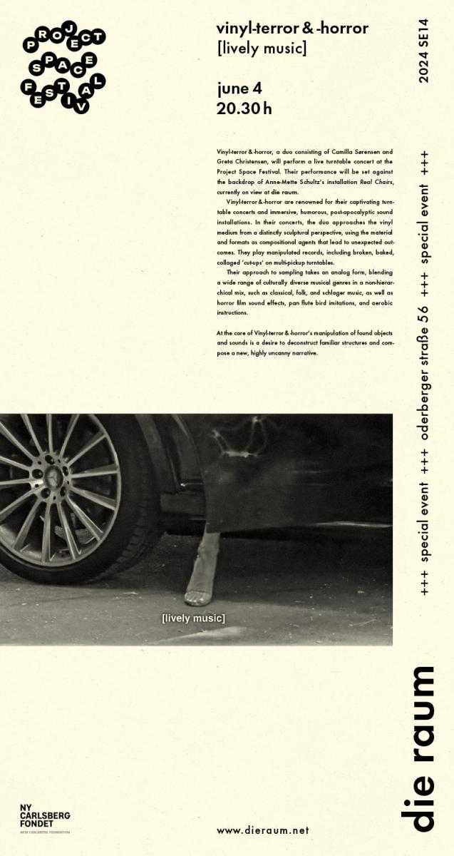 Vinyl-terror & -horror, a duo consisting of Camilla Sørensen and Greta Christensen, will perform a live turntable concert at the Project Space festival. Their performance will be set against the backdrop of Anne-Mette Schultz's installation 'Real Chairs', currently on view at die raum.