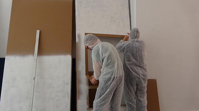 Due to COVID 19 Axel Obiger /the above mentioned artists were invited to an exhibition at Paper Gallery Manchester and therefore could not join the show in GB. Axel Obiger made the decision to fabricate the interior of PAPER gallery in 1:1 scale out of cardboard. Matching PAPER’s blue walls alongside specific features within the gallery - the window, pipe work, and radiator – Axel Obiger have used this set to curate and install an exhibition of work on paper.