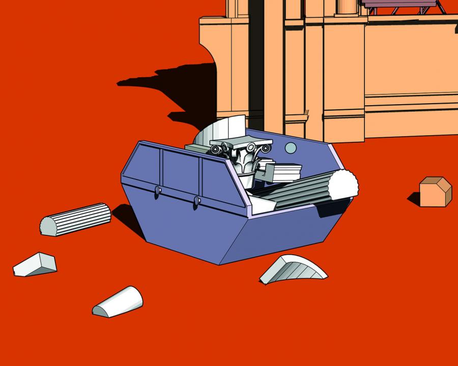 Onur Ceritoglu creates a situation to figure out the possibilities of living in a debris container through an architectural illustration and performative work depicting ruination and survival.