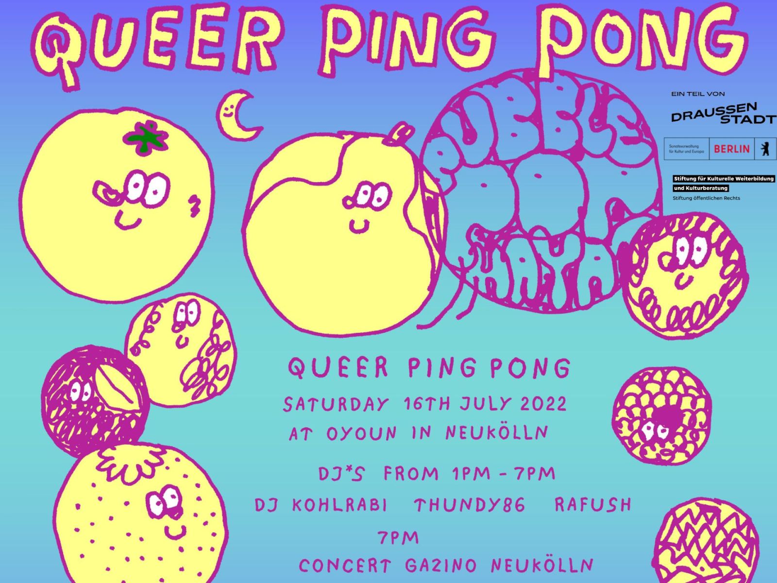 Ping Pong or table tennis is a queer sport - it is open to almost everyone, is contactless and is a lot of fun for beginners and pros alike. Therefore, four table tennis tables will be set up for a queer ping pong tournament on Saturday – for us, for you, for the community. All in the beautiful garden of Oyoun, the queer feminist space in Neukölln.