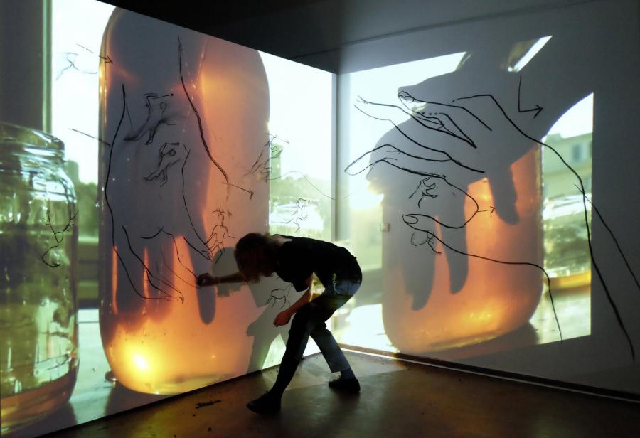 Adéla Součková would later comment them in the installation and by drawing and texting directly on the wall. The aim is to create a virtual cave, where a golden cage with ribs, in a shape of cartographical boarders, is placed. They suggest limit of space-time, possibilities of human in comparison/ contrast with technologies and the difference in between, how data surveillance gives a trace of ourselves, how open source heaven becomes paranoia, a never ending voyeurism like in an Hitchcock film.